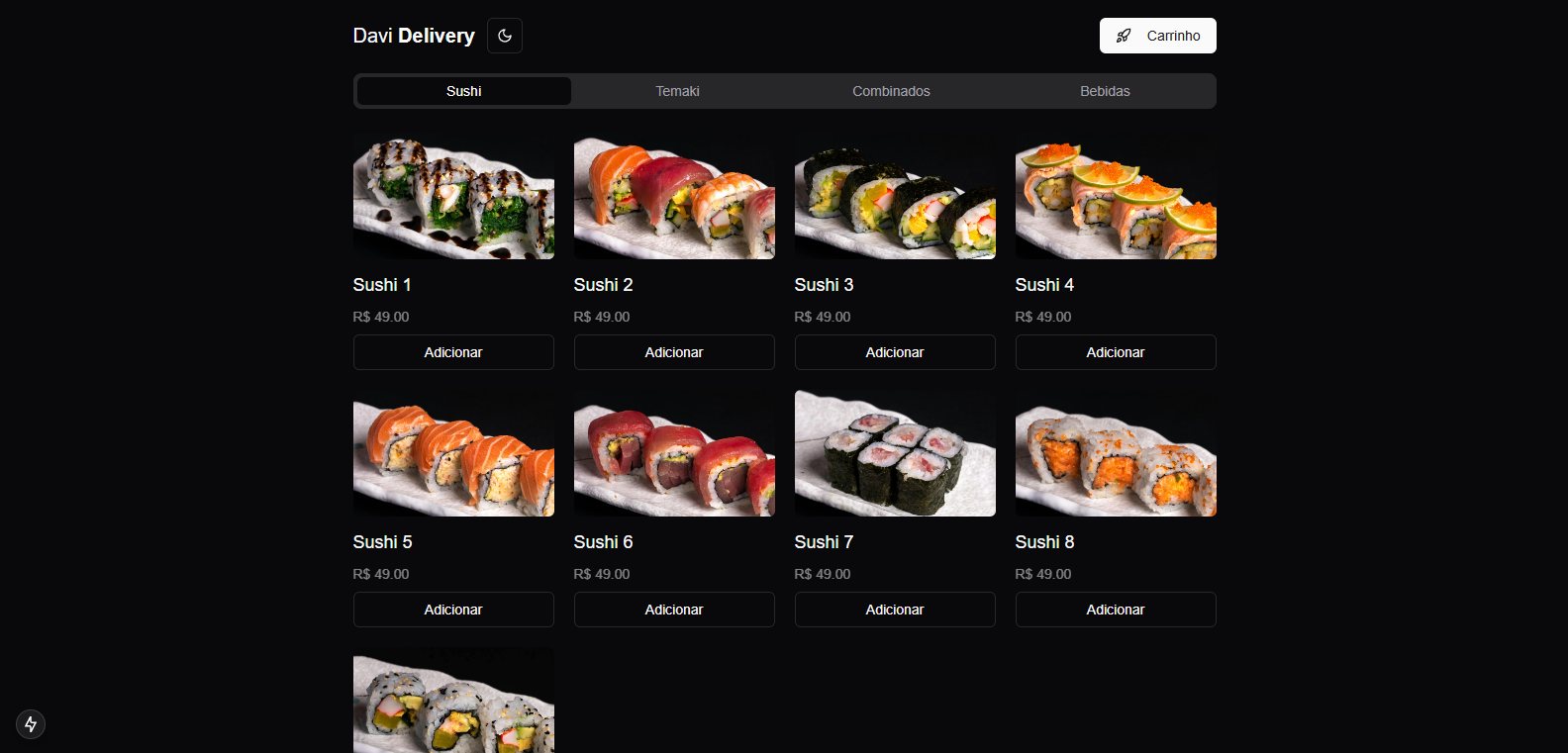 Site de delivery de comida. Feito com componentes da biblioteca Shadcn.